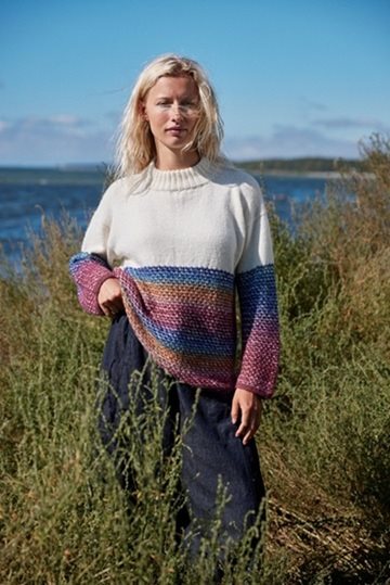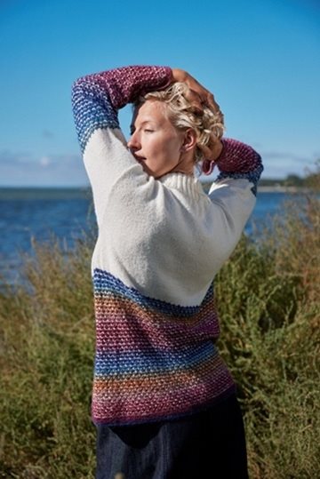 Ryg og forstykke samles og strikkes rundt først i glatstrikning med bundfarve, og siden i mønster med 2 farver på skift, arb afsluttes med rillekant nederst. Der samles m op i ærmegabene og ærmerne strikkes først i glatstrikning i bundfarve, og siden i mønster med to farver på skift, til ærmet afsluttes med rillekant ved håndleddet.